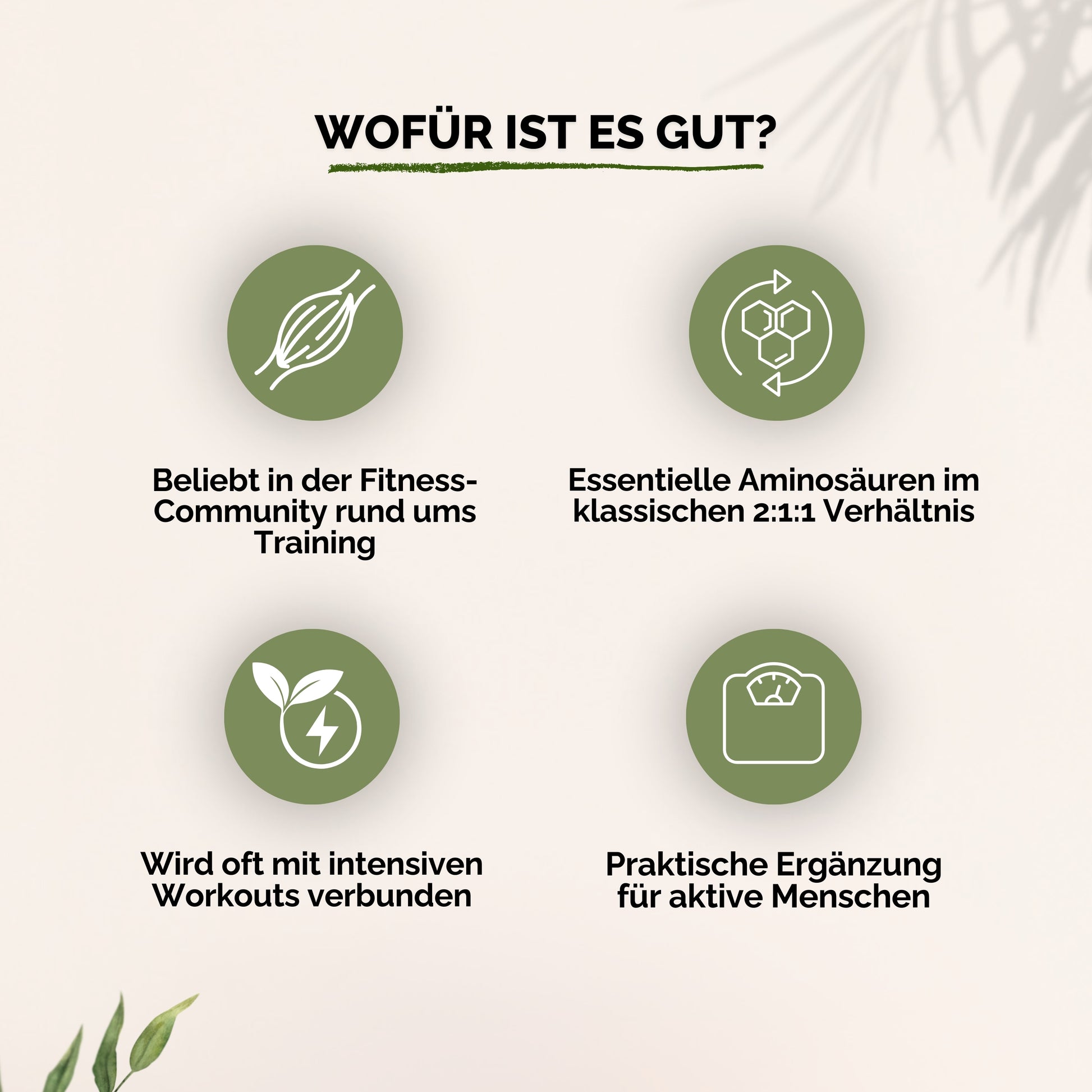 Die hochwertigen verzweigtkettigen Aminosäuren Leucin, Isoleucin und Valin sind im bewährten Verhältnis 2:1:1 kombiniert für alle Athletes, die ihre Regeneration und den Muskelaufbau unterstützen wollen.