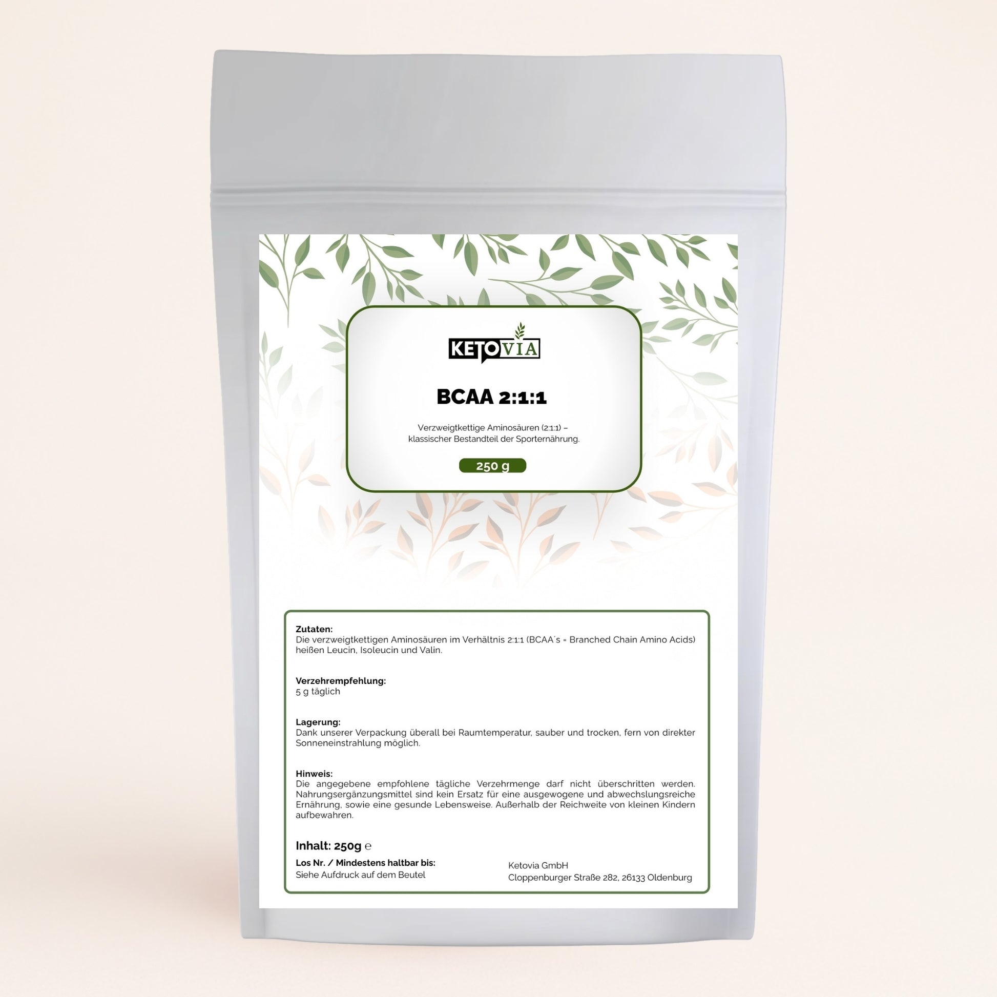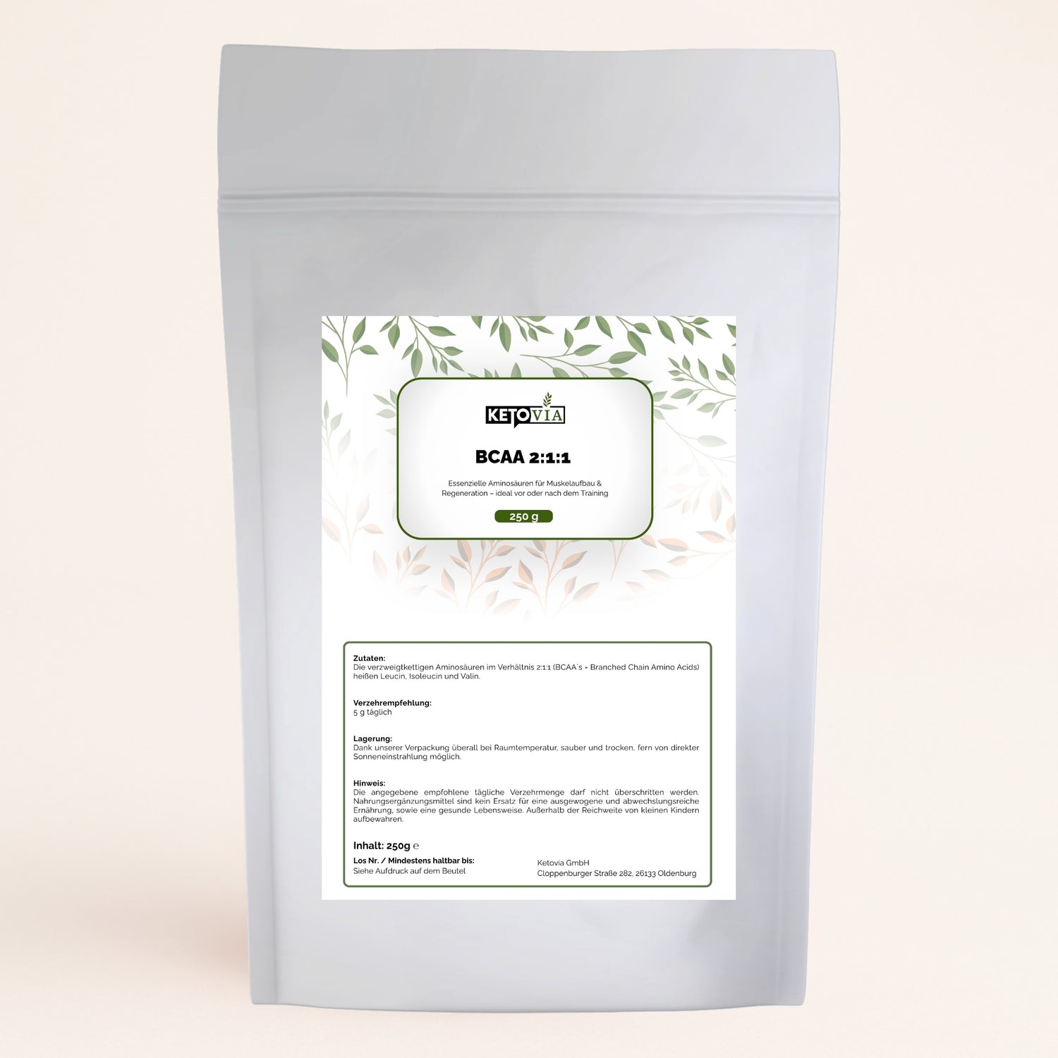 Mit dem BCAA Pulver von Ketovia hast du einen effektiven und unkomplizierten Weg, deine Muskeln vor bzw. nach dem Training optimal zu unterstützen.