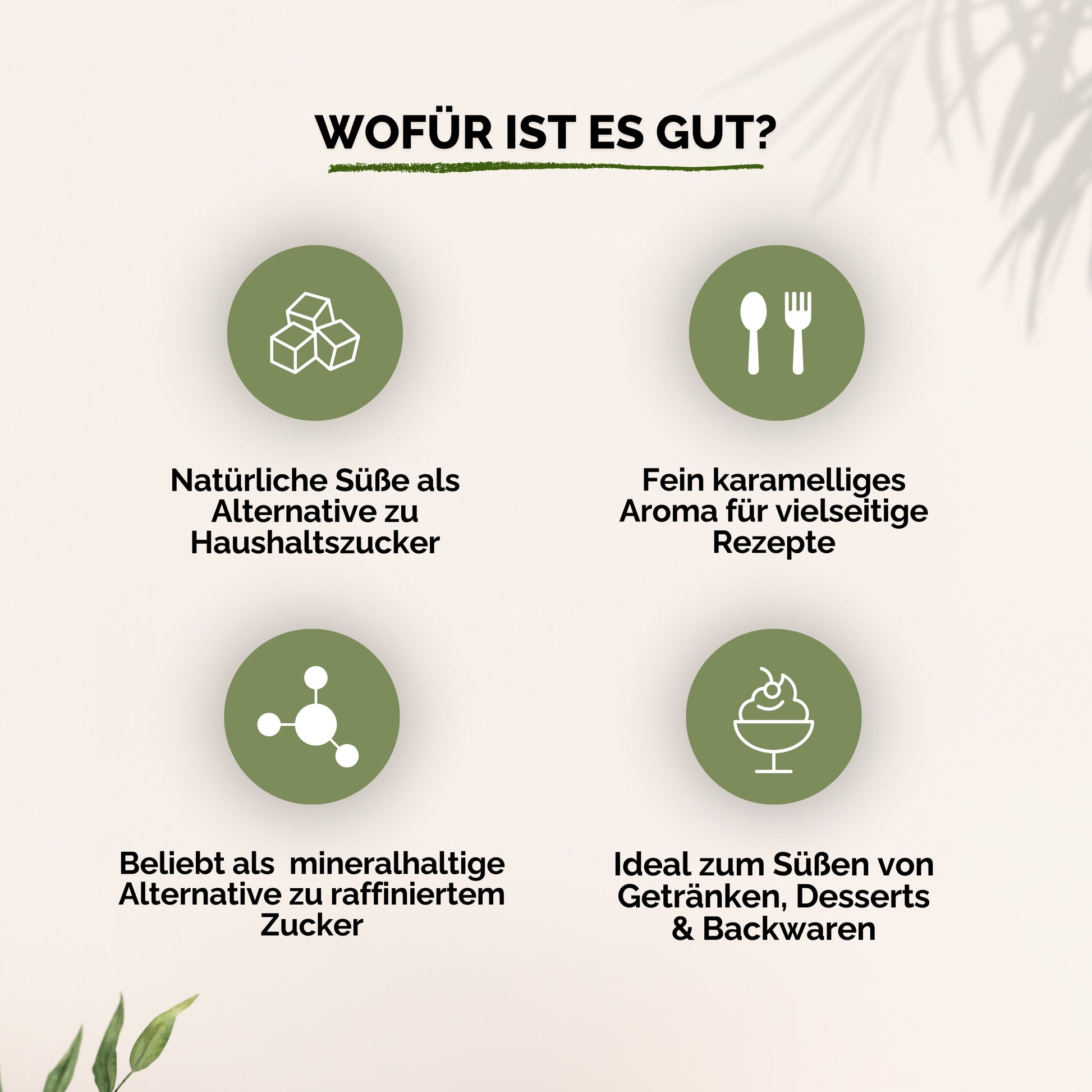 • 100 % Bio Kokosblütenzucker – pur, unverfälscht und aromatisch