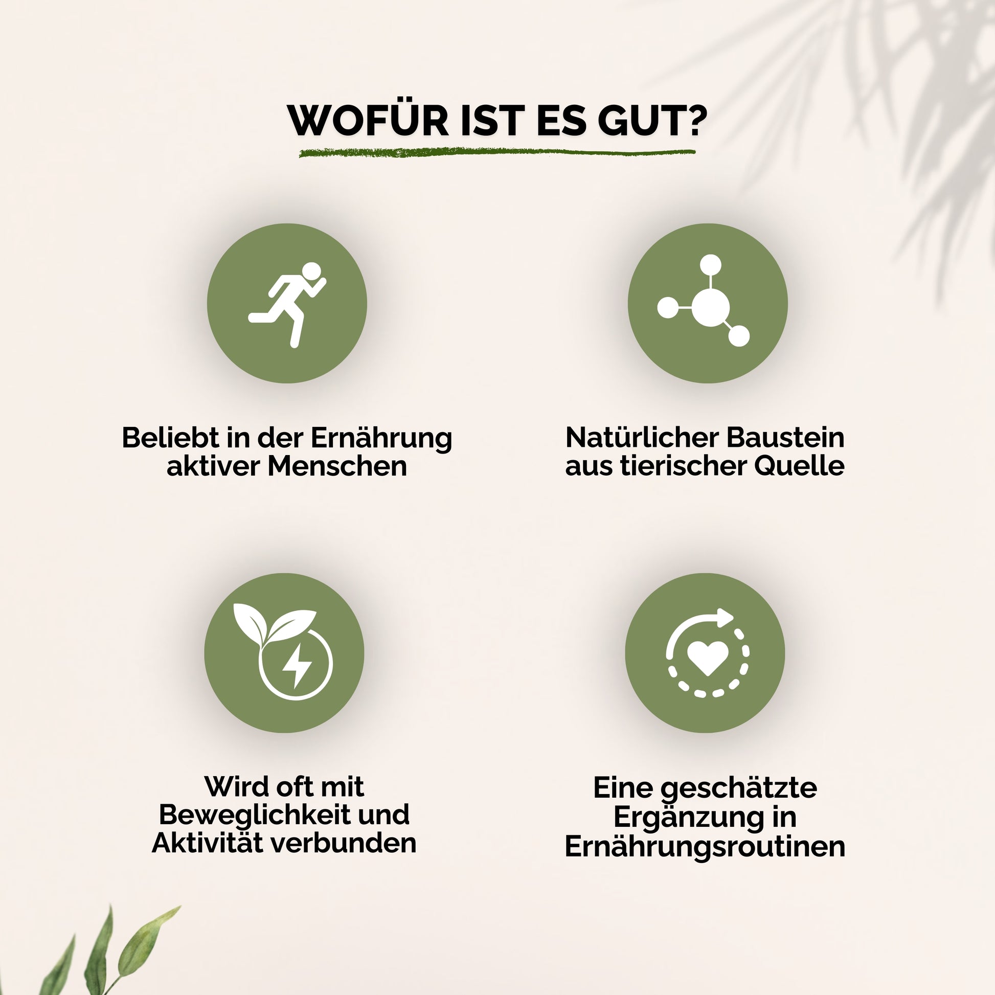 Es unterstützt die Gelenkfunktion und kann helfen, Knorpelabbau zu verlangsamen sowie Beschwerden bei Gelenkverschleiß (z. B. Arthrose) zu lindern.