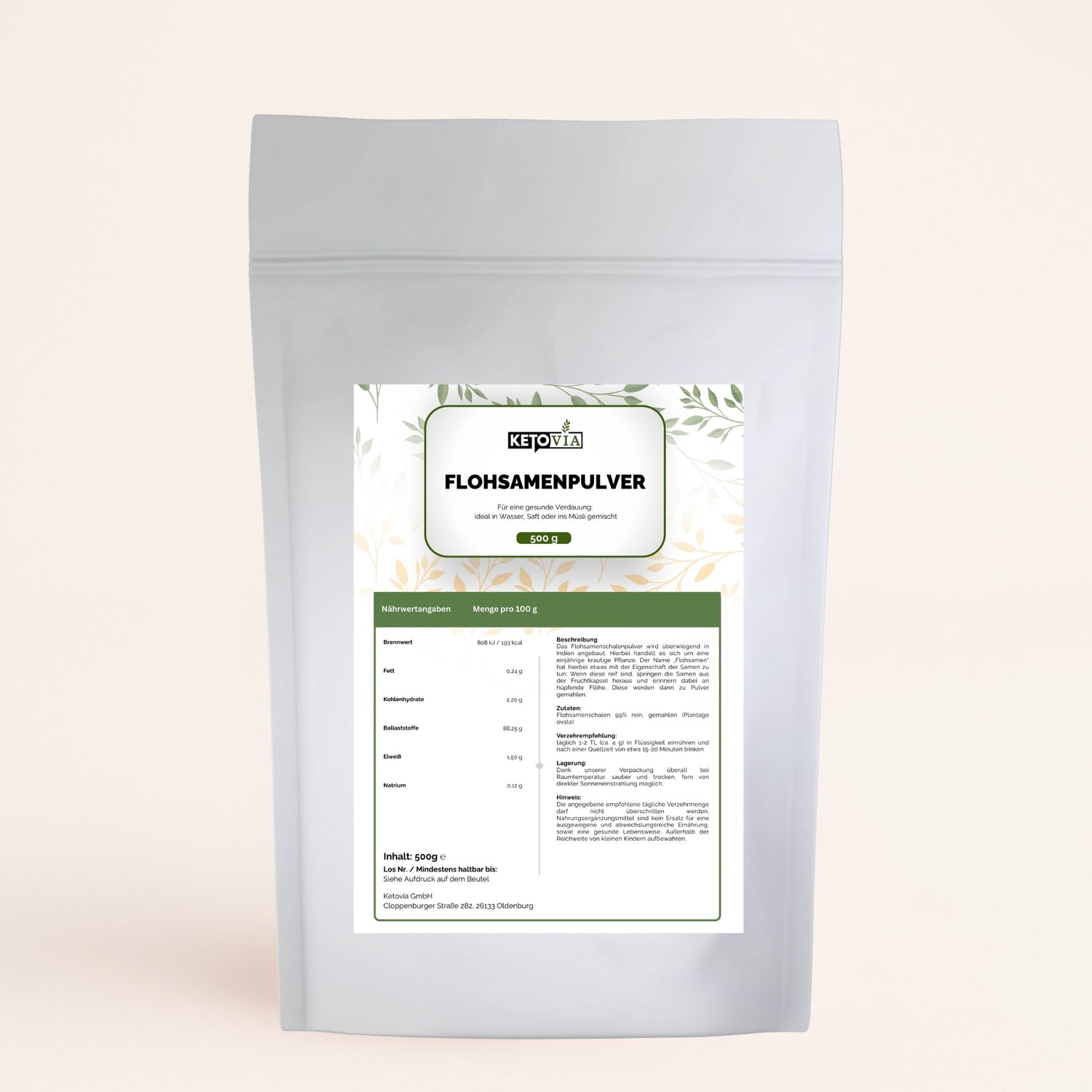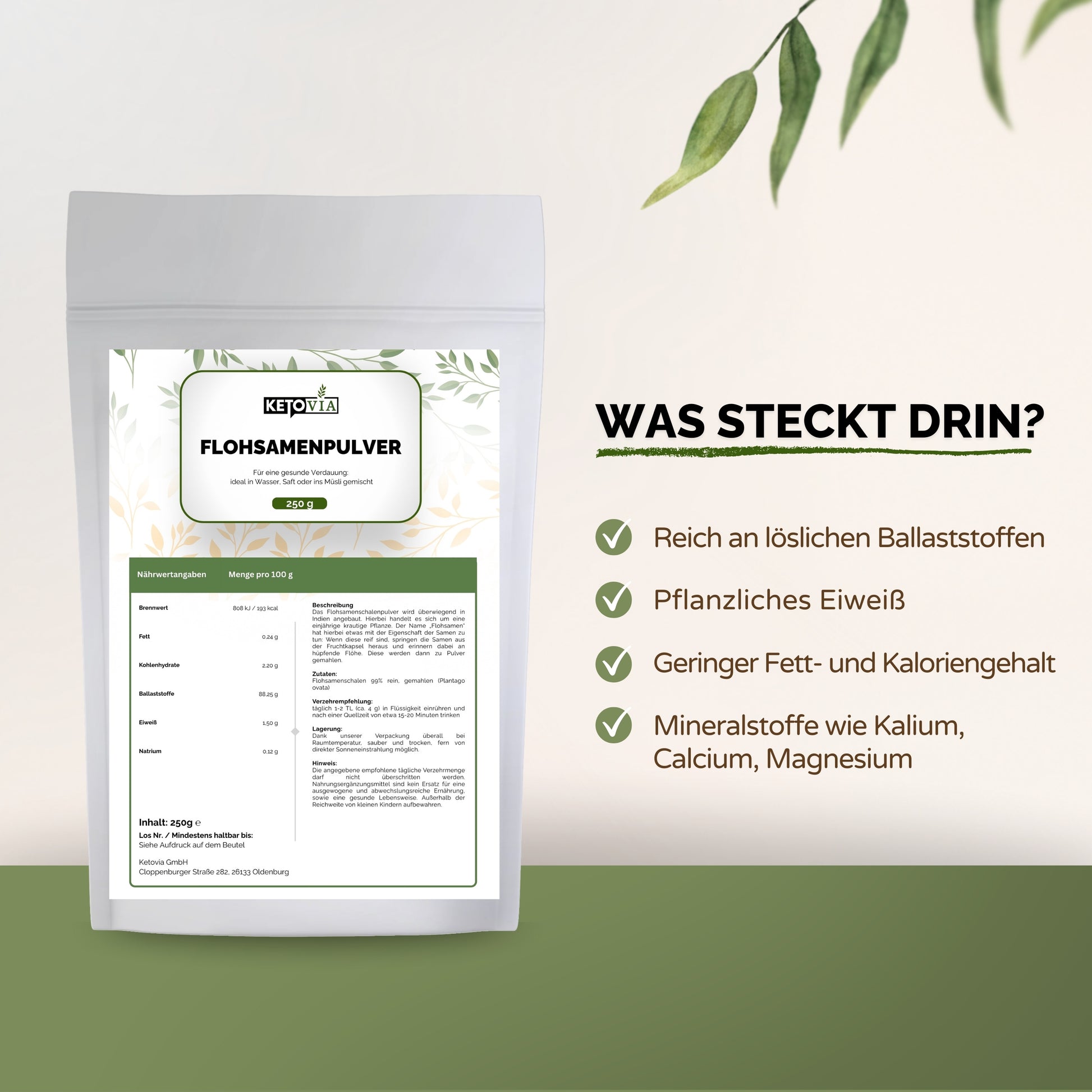 Flohsamenpulver wird aus gemahlenen Flohsamenschalen (Plantago ovata) hergestellt und bietet über 88 g Ballaststoffe pro 100 g, darunter wertvolle Quellstoffe, die das Volumen im Magen-Darm-Trakt erhöhen und somit das Sättigungsgefühl fördern.