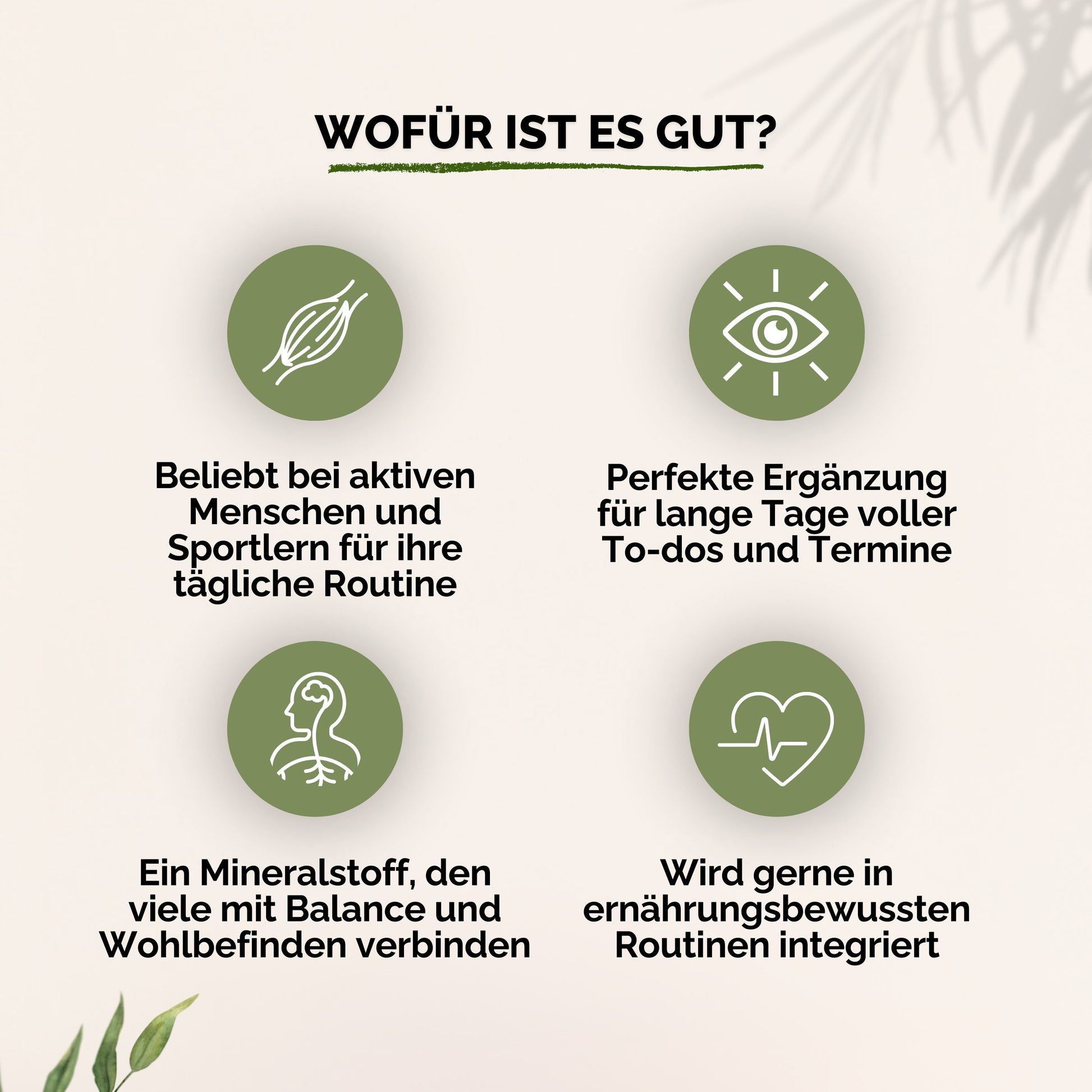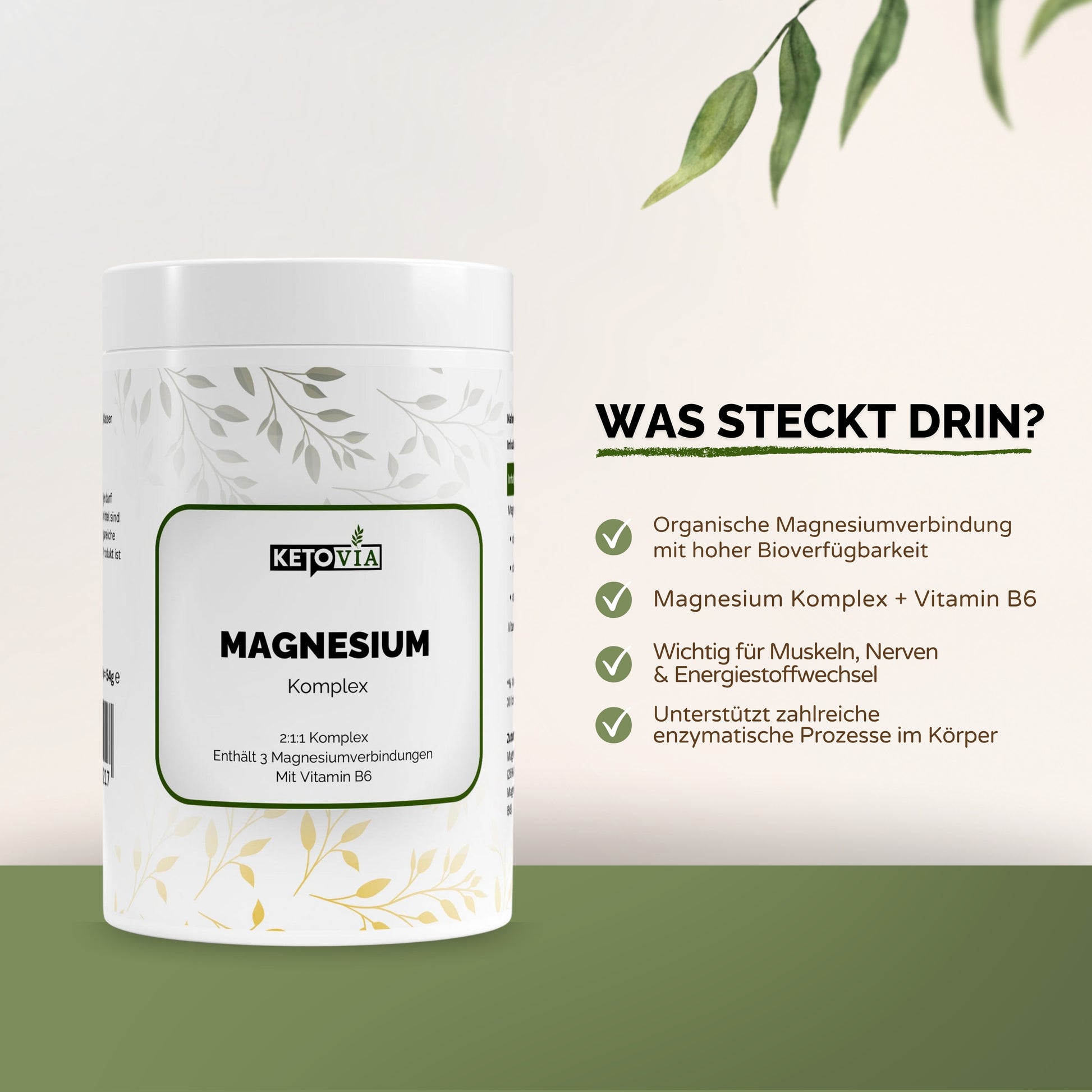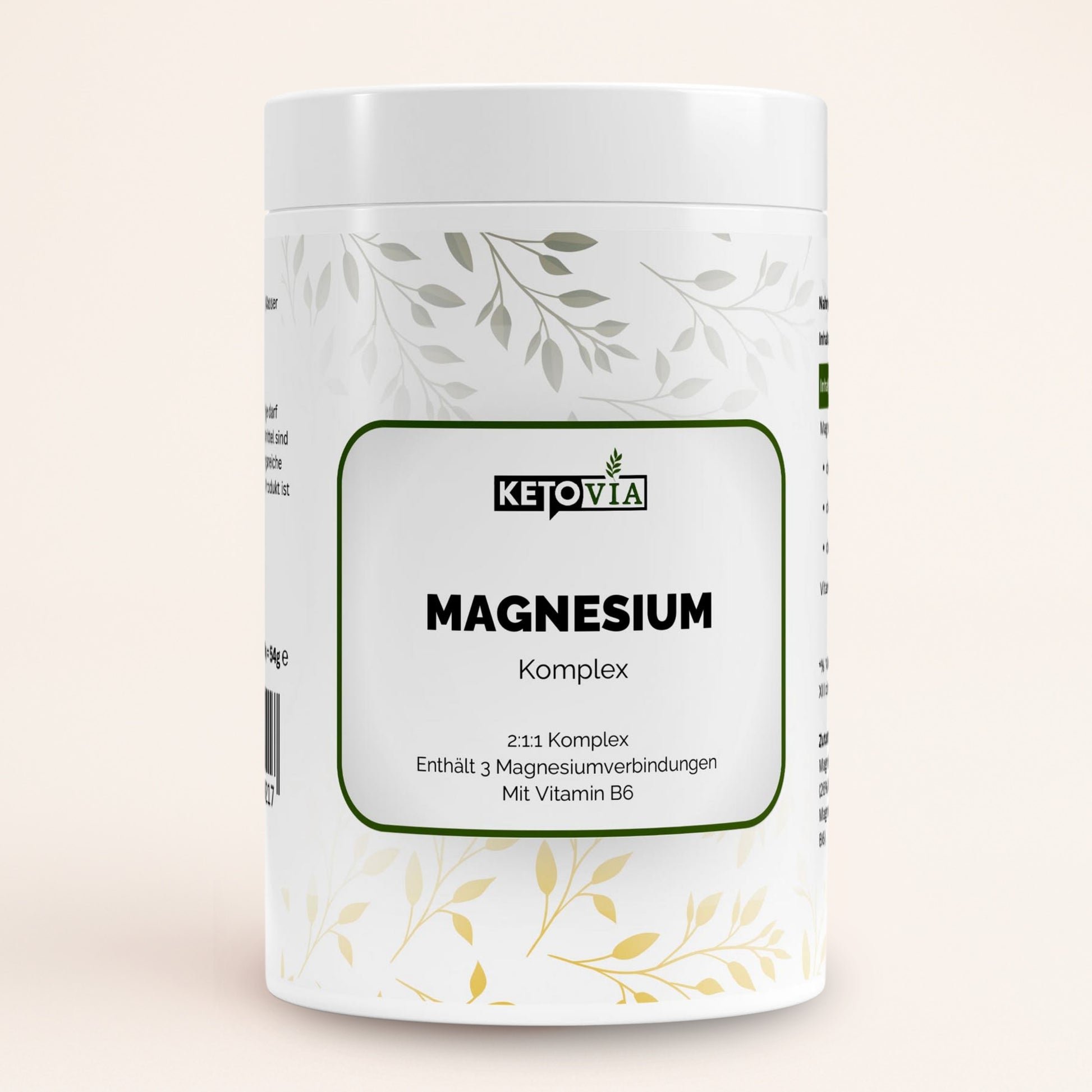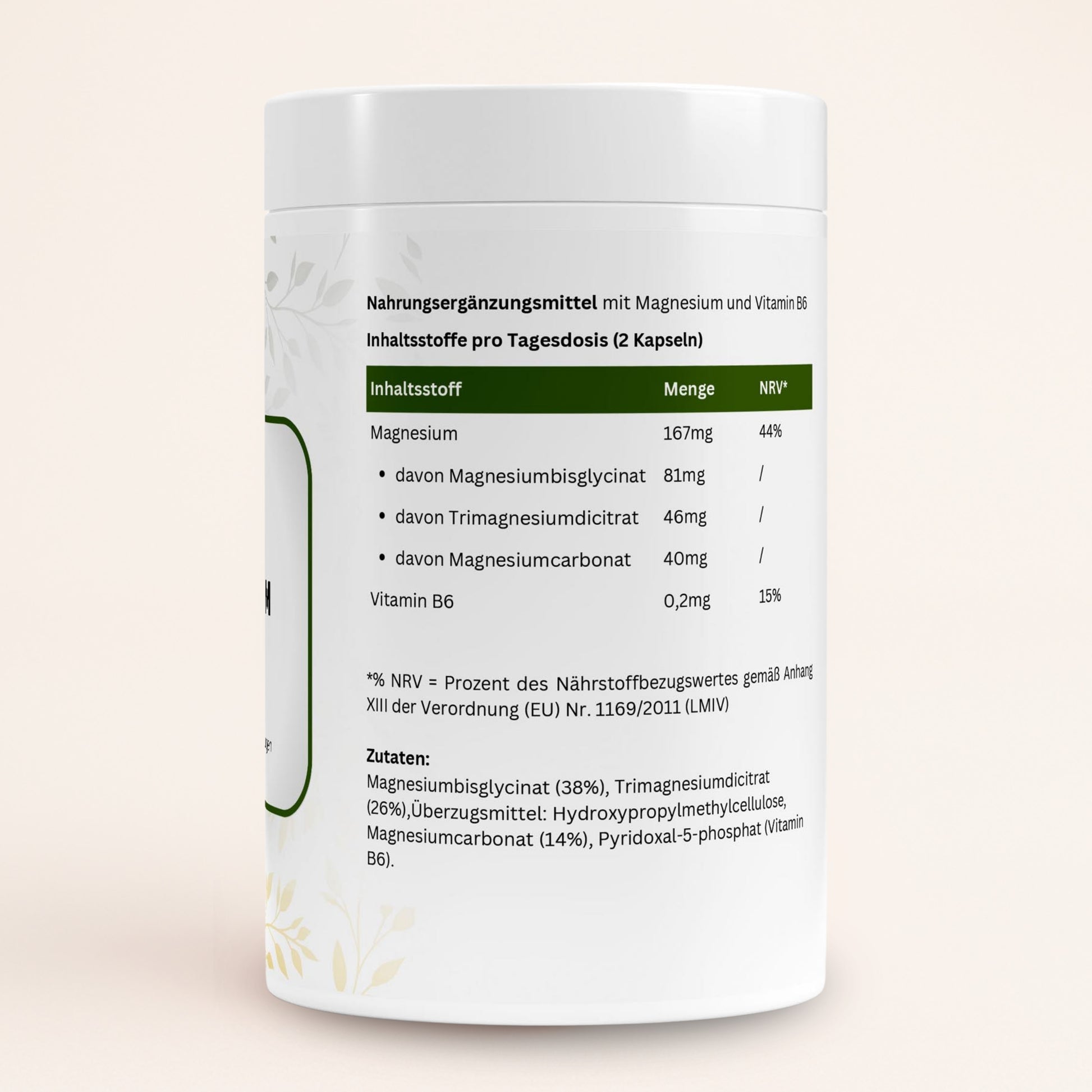 Der Magnesium Komplex vereint drei hochwertige Magnesiumverbindungen – Bisglycinat, Trimagnesiumdicitrat und Magnesiumcarbonat – in einem optimalen 2:1:1 Verhältnis. Ergänzt mit Vitamin B6 zur Unterstützung von Energiestoffwechsel, Nerven und Muskelfunktion.