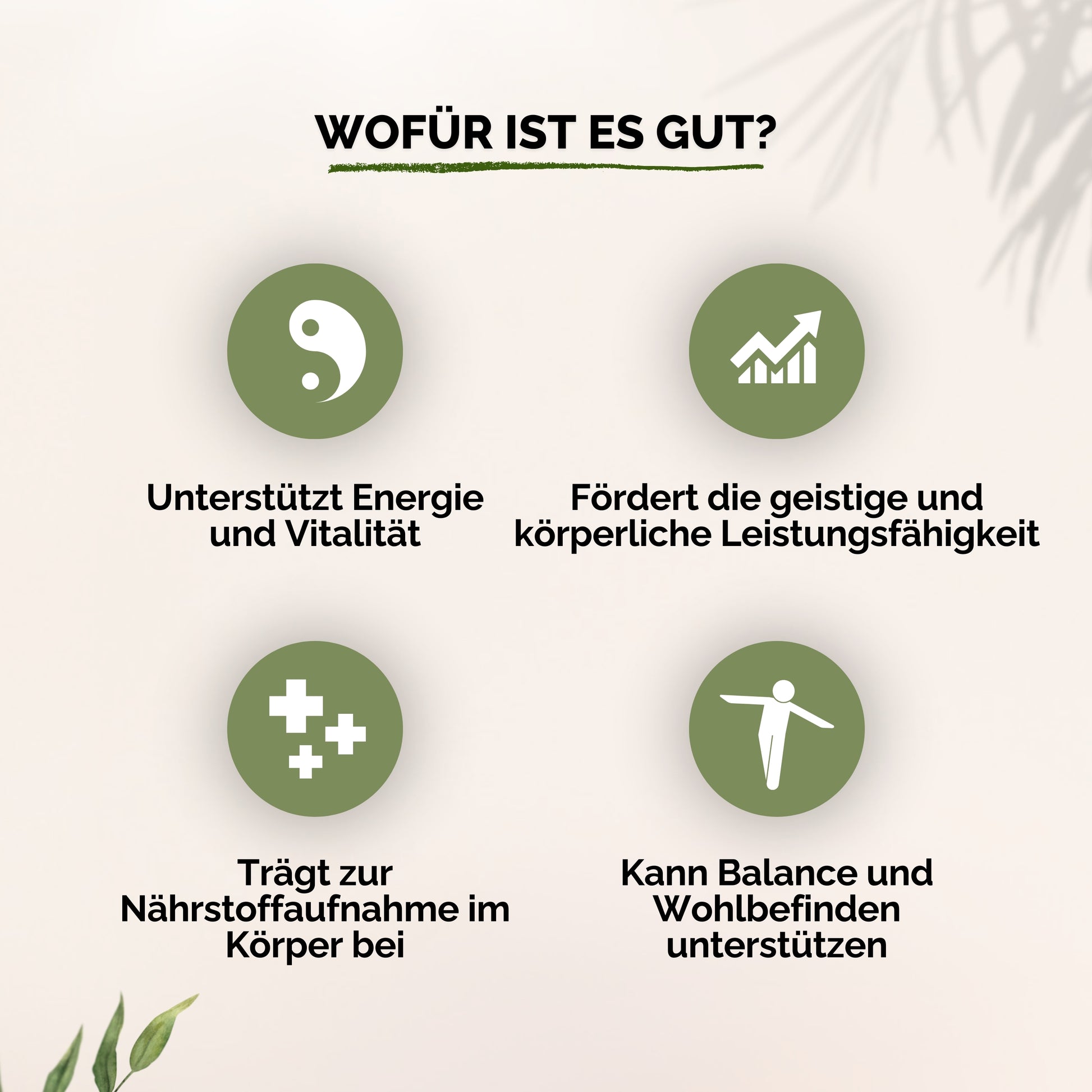 Traditionell eingesetzt für Vitalität, Ausdauer und mentale Klarheit, erhältst du diese Power nun modern verpackt: