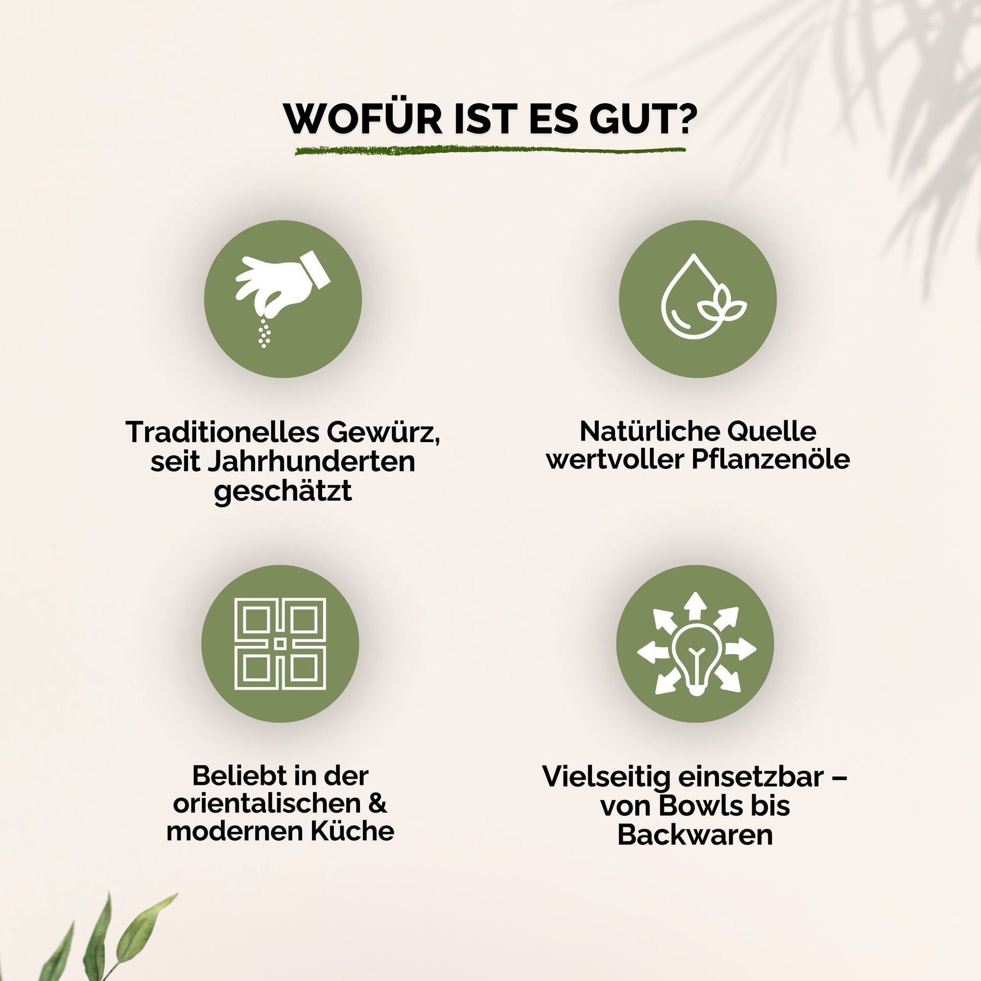 Nutze die Samen ganz oder gemahlen zum Verfeinern von Speisen, Dressings, Backwaren oder orientalischen Gerichten. Die Einsatzmöglichkeiten sind vielseitig.