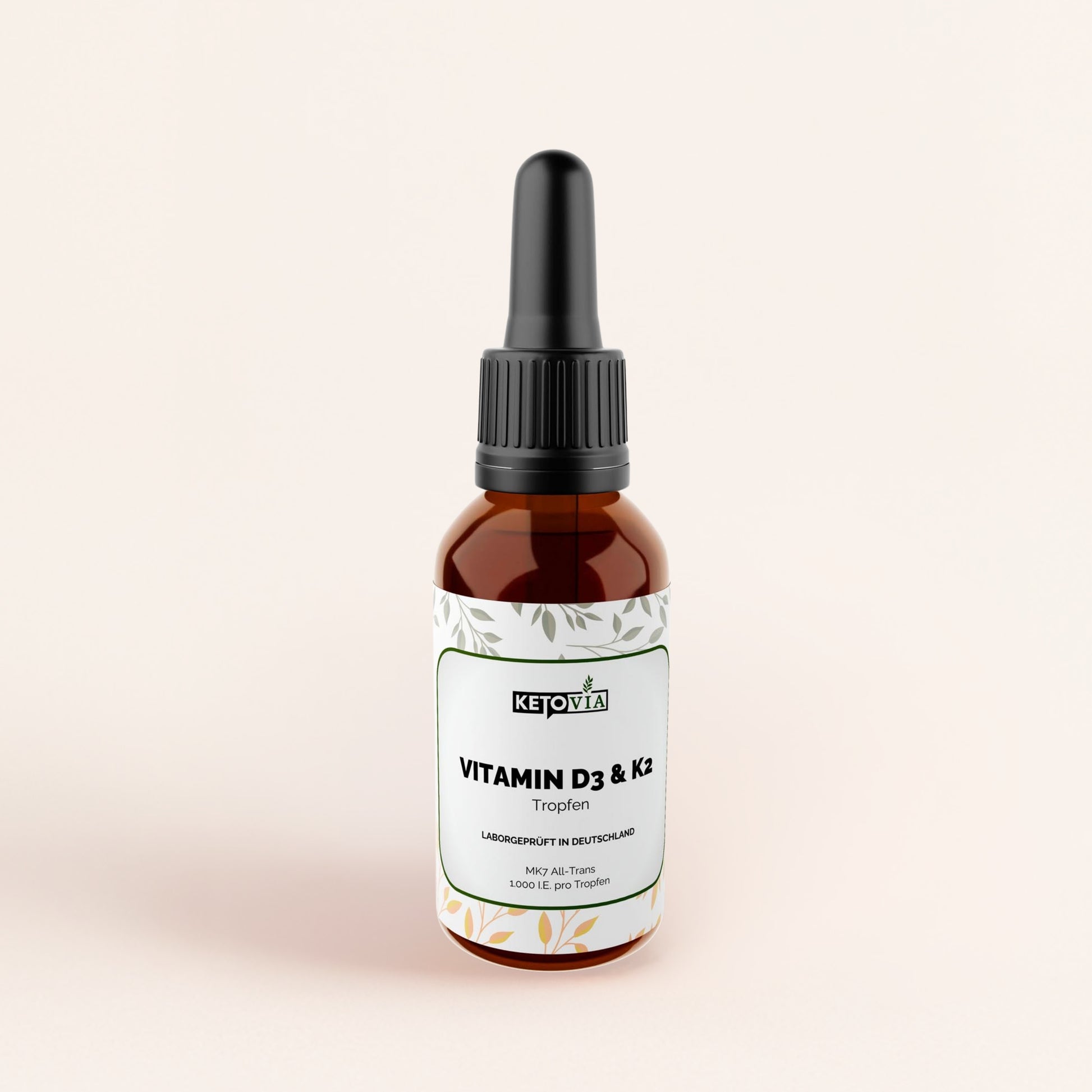 Die Vitamin D3 & K2 Tropfen kombinieren hochdosiertes Vitamin D3 (1.000 I.E. pro Tropfen) mit Vitamin K2 (MK7 all-trans) für eine optimale Aufnahme. Gelöst in hochwertigem Kokosöl für beste Bioverfügbarkeit.