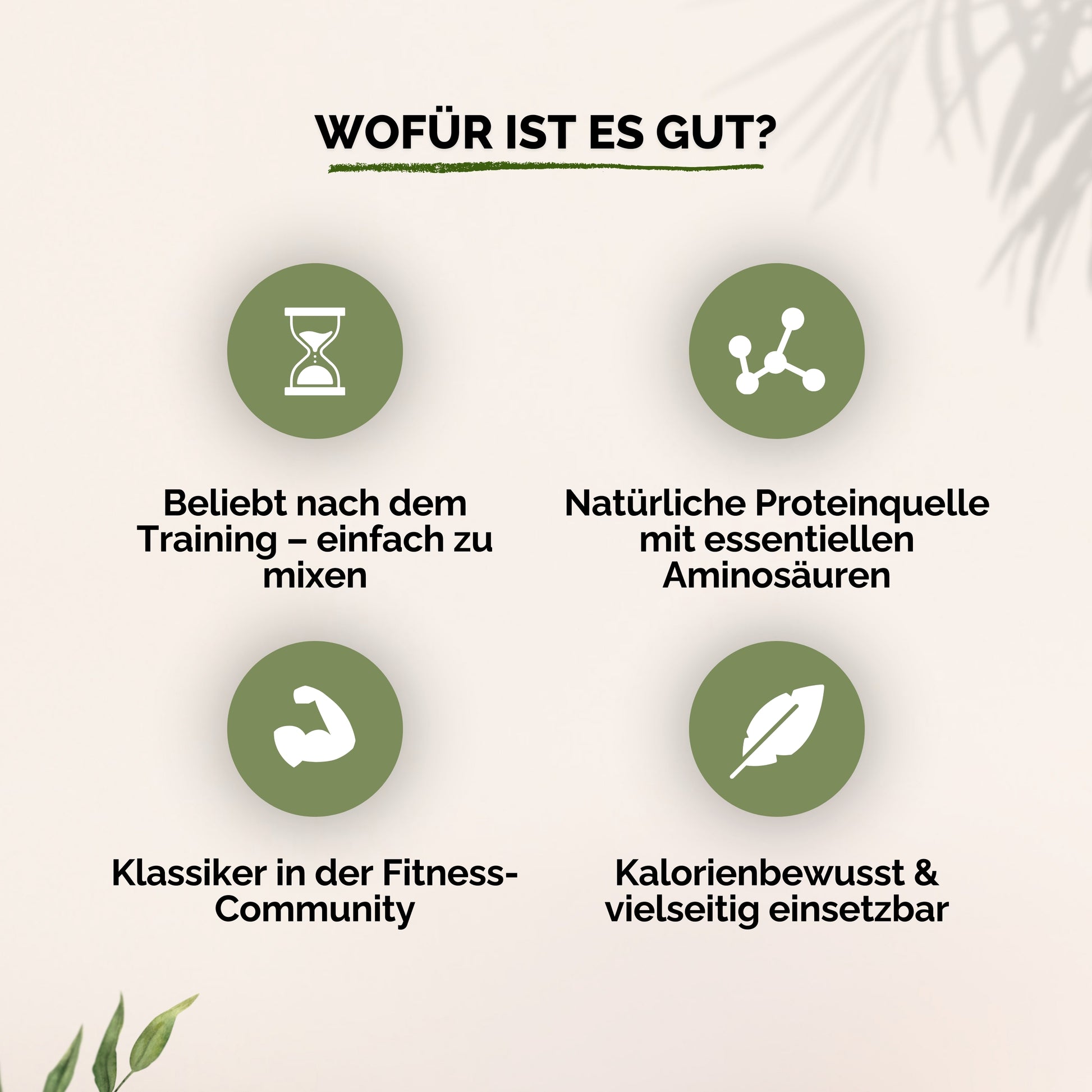 Dank seiner hohen Bioverfügbarkeit unterstützt es optimal den Aufbau und Erhalt von Muskelmasse. Außerdem hilft es beim Appetitmanagement und fördert ein langes Sättigungsgefühl – perfekt für sportlich Aktive und alle, die bewusst essen möchten.